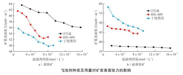 結(jié)果發(fā)現(xiàn):隨著起泡劑用量的增加,黃鐵礦與磁黃鐵礦的表面張力均整體呈下降趨勢。對于黃鐵礦礦漿表面張力的影響,2號油>HX-609>丁銨黑藥,HX-609的表面張力雖然不是最低,但 HX-609達(dá)到最低礦漿表面張力所用藥劑用量最少,可以明顯降低藥劑使用成本。對于磁黃鐵礦礦漿表面張力的影響,丁銨黑藥>HX-609>2號油,且三者差值較大,2號油用量為3×10?? mol/L時可顯著降低礦漿表面張力。