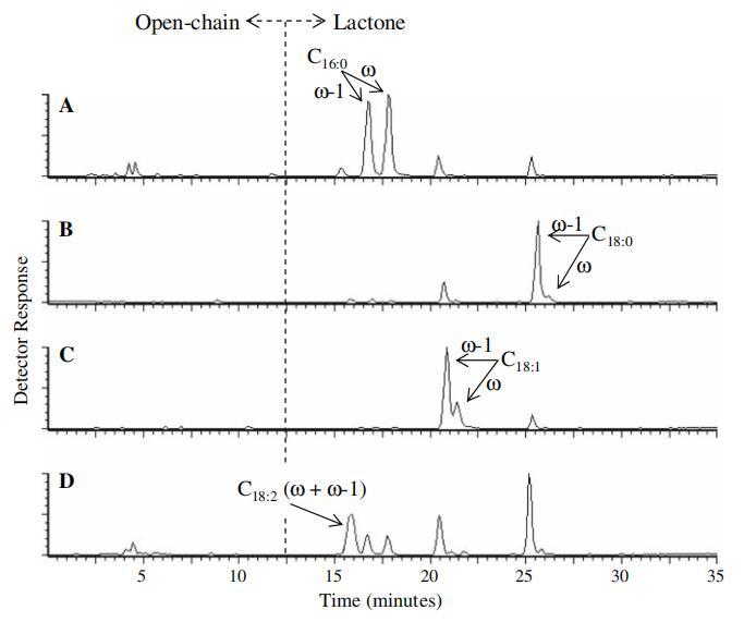 在4個(gè)SL中,只有一個(gè)SL-p的x-連桿總數(shù)大于x-1-連桿。 具體而言,在75%的棕櫚酸殘基中,39%通過x位置連接,36%通過x-1位置連接。 在其他情況下,大部分(至少71%)的脂肪酸通過x-1位置結(jié)合(亞油酸在所用LC方法下不可溶解,因此被報(bào)告為x和x-1組合結(jié)構(gòu))。 這些結(jié)果表明,為了形成內(nèi)酯,糖苷鍵和酯鍵之間必須至少有15個(gè)甚至17個(gè)碳單元。 SL-o和SL-s中對(duì)x-1連接的極大偏好表明17個(gè)碳是內(nèi)酯形成的首選碳。 然而,通過將棕櫚酸連接到x碳處的SL,鏈長度增加了1個(gè)碳單元(鍵間16個(gè)碳),使得內(nèi)酯的形成比連接到x-1碳(鍵間15個(gè)碳)時(shí)更有利。 SL-p中存在C17:0脂肪酸含量較低(3%)的SLs進(jìn)一步證實(shí)了這一點(diǎn),而SL-s、SL-o和SL-l中沒有C17:0脂肪酸夾雜的跡象。 根據(jù)這些數(shù)據(jù)和二乙酰化內(nèi)酯分布(見表2),得出結(jié)論,對(duì)于SL包裹體測(cè)試的單個(gè)脂肪酸,其優(yōu)先順序?yàn)橛退帷⒂仓帷⒆貦八岷蛠営退幔约癈18脂肪酸, 單原子飽和優(yōu)于飽和和雙不飽和。