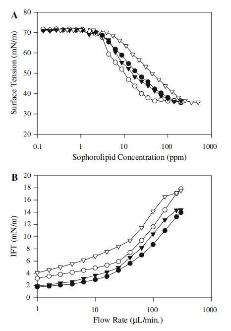 槐脂(SLs)相對(duì)較大的生產(chǎn)能力、可再生性和“生態(tài)友好性”有助于提高其作為家庭和個(gè)人護(hù)理產(chǎn)品中某些石化表面活性劑的添加劑或替代品的工業(yè)意義。 然而,為了考慮用于工業(yè)用途,SLs也必須廉價(jià)生產(chǎn),并且必須了解和控制其物理性質(zhì),以便準(zhǔn)確預(yù)測(cè)SLs在各種應(yīng)用中的潛力。 表面張力(ST)、臨界膠束濃度(CMC)、界面張力(IFT)和水溶性是表面活性劑應(yīng)用特別關(guān)注的四個(gè)性質(zhì)。 理想情況下,良好的表面活性劑是水溶性的,表現(xiàn)出較低的CMC,并導(dǎo)致最小表面張力(min.ST)小于30 mN/m。 這些性質(zhì)中的每一種都可以根據(jù)表面活性劑的化學(xué)組成進(jìn)行控制。 通過在多種不同的混合基質(zhì)(包括葡萄糖和4種不同的脂肪酸)上生長棉鈴蟲,我們產(chǎn)生了具有不同化學(xué)分布的SLs。 簡單地通過改變脂肪酸來生產(chǎn)不同的SLs的能力提供了在發(fā)酵水平上管理物理性質(zhì)的前景,并通過在應(yīng)用水平上以不同的比例混合SLs。