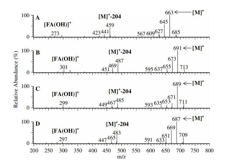 圖3正大氣壓化學(xué)電離(APCI)-來自圖2中每個(gè)TIC色譜圖基峰的質(zhì)譜圖。 圖2的TIC中的C16:0二乙酰化槐脂內(nèi)酯(RT=16.7分鐘)、圖2的TIC中的C18:0二乙酰化槐脂內(nèi)酯(RT=25.2分鐘)、圖2c的TIC中的C18:1二乙酰化槐脂內(nèi)酯(RT=20.7分鐘)和圖2d的TIC中的C18:2二乙酰化槐脂內(nèi)酯(RT=15.8)。 ([M]+=質(zhì)子化分子離子;[M]+-204=質(zhì)子化分子離子-減去乙酰化己糖(質(zhì)量204);[FA(OH)]+=質(zhì)子化羥基脂肪酸)