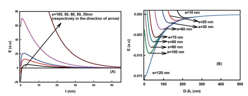 圖6足跡直徑對(duì)粘粒組件的影響。(A) 作為界面區(qū)域厚度函數(shù)的能量變化(L?60 nm,T?298 K,f?0.5,姜黃素納米顆粒半徑R?50 nm,疏水衰減長(zhǎng)度x0?1 nm,界面張力?40 mN m-1)。(B) 粘粒–粘粒相互作用作為粒間分離D的函數(shù),使用方程(5)計(jì)算。對(duì)于更大的封裝外形直徑,能量最小值變得更深,對(duì)于大于100 nm的s,能量最小值變得更有吸引力。