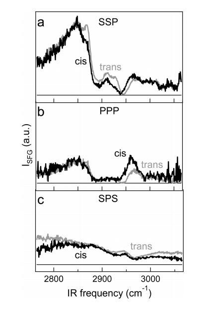 圖5.(a)在P的反式和順式狀態下,每分子65?2面積的DT Azo-5P純單層的標準化VSFG光譜與SSP極化分別為6和20 mN/m。(b)與a部分類似,但對于PPP極化。(c)反式和順式狀態的SPS極化中的SFG光譜( ~ 每分子78?2),壓力為2和15 mN/m。三個面板具有相同的垂直刻度。