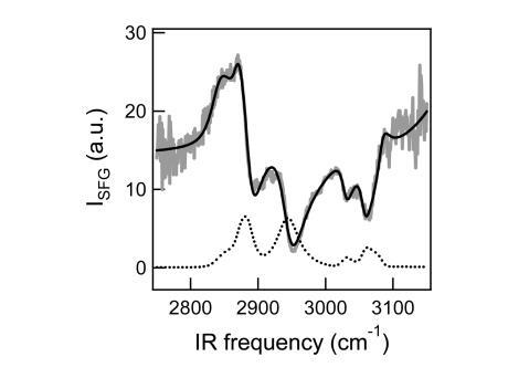 DT Azo-5P單分子膜的振動和頻發生光譜(VSFG)。圖3a描繪了在3 mN/m的表面壓力和75?2的分子面積下,處于反式狀態的光脂DT Azo-5P凝聚相的單層的灰色VSFG光譜。光譜顯示了CH2的共振(~2840 cm-1)和CH3對稱拉伸模式(~2860 cm-1),CH2和CH3不對稱拉伸模式~2890和2940 cm-1,以及3000 cm-1以上的芳香CH信號,源自偶氮苯部分。2,11-13 3100 cm-1以上,光譜主要由水亞相的OH振動控制。頻譜在低頻時有一個不尋常的高(非零)基線,這表明一個高非共振信號。為了檢查這種可能性,使用以下表達式擬合光譜:11,12