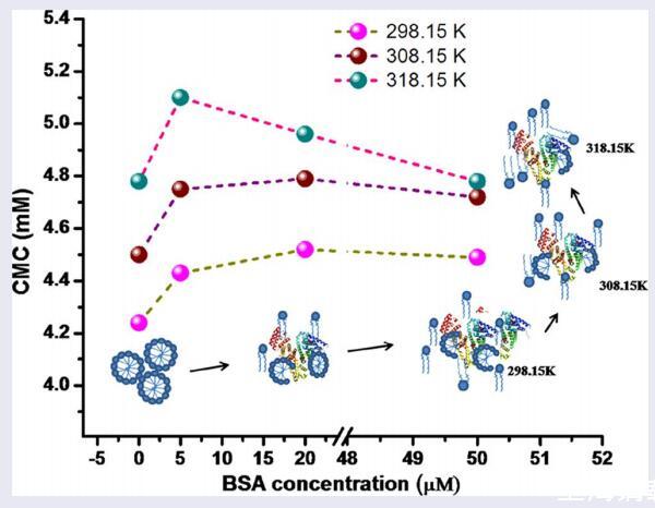用表面張力法研究了牛血清白蛋白對IL型gemini表面活性劑[C10-4-C10im]Br2表面性質的影響。研究了不同溫度下臨界膠束濃度(CMC)與BSA濃度的關系。[C10-4-C10im]Br2的CMC隨著BSA濃度的增加以及系統溫度的升高而增加。界面參數,即;計算了最大表面過量濃度(Γmax)、每分子最小面積(Amin)和CMC下的表面壓力(ΔCMC)。此外,利用表面張力數據評估了吸附和膠束化的熱力學參數。結果表明,[C10-4-C10im]Br2與BSA的結合是自發的、放熱的。該過程是熵驅動的,疏水相互作用是主要驅動力。