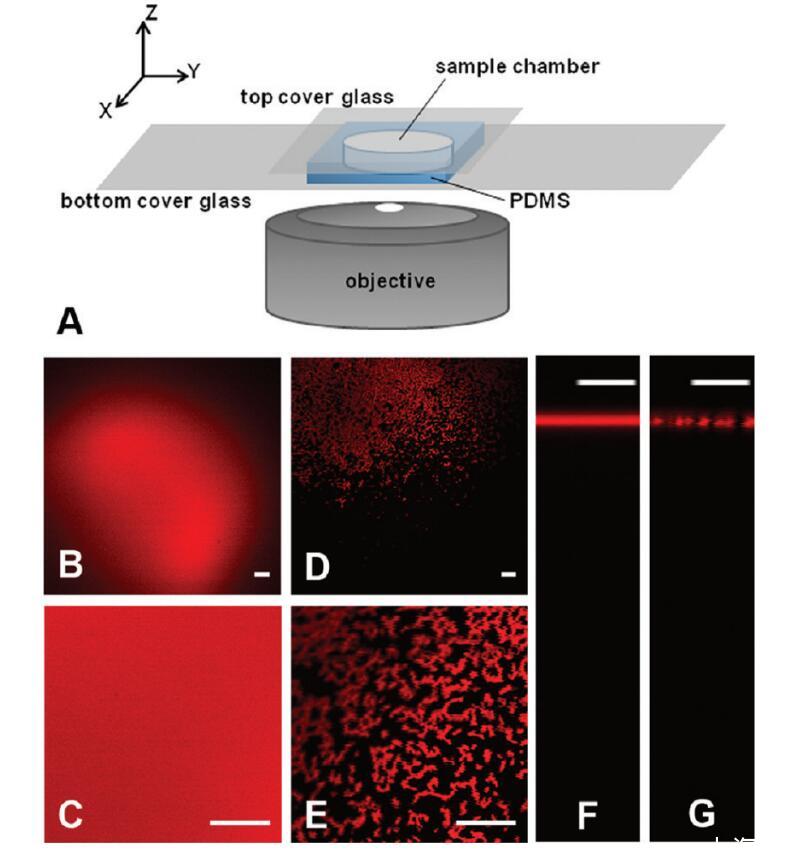 圖1。(A)樣品室和倒置顯微鏡設置。(B-G)在AWI條件下,pH 7.2,離子強度=193 mM的PBS中HSA-TR的共焦圖像。(B,C)HSA-TR(0.050 mg/mL)或(D,E)HSA-TR(0.025 mg/mL)的XY平面圖像。圖像C和E使用4倍光學變焦。穿過(F)HSA-TR(0.050 mg/mL)或(G)HSA-TR(0.025 mg/mL)AWI的XZ平面圖像。比例尺:20μm。