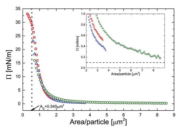 壓力-面積等溫線是通過在Langmuir槽上對擴散單分子膜進行3組不同實驗得到的。這些等溫線中的面積坐標根據吸附在界面上的顆粒數量進行縮放。如圖1所示,所有曲線都折疊到一個圖上。在增加壓縮時,壓力最初略有變化,但低于2 mm2/顆粒時,壓力急劇增加。曲線的斜率首先增加,但在約27 mN m-1處達到最大值,在此有一個拐點,然后是一個稍弱的斜率。如圖1中的虛線所示,對應于該拐點的每粒子面積(Ac)值為0.545 mm2。假設粒子緊密堆積,這對應于~835 nm的粒子間距離,遠大于在本體溶液中測量的粒子流體動力學直徑(590 nm),表明粒子確實發生了實質性變形。如圖1的插圖所示,0.5 mN m-1級的有限表面壓力(即遠高于我們的檢測極限0.1 mN m-1)實際上已經可以在約4 mm2的每粒子面積上測量。插圖還表明,在兩個不同的朗繆爾槽上進行的不同實驗之間,P的絕對值在0.3 mN m-1范圍內可重復。