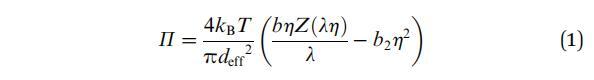 吸附在流體-流體界面上的顆粒相互作用并產生表面壓力(P),這是3D系統中壓力的2D模擬。通過進一步擴展這種類比,還可以通過狀態方程將表面壓力與其他狀態參數(如數密度和溫度)聯系起來。對于吸附在流體-流體界面上的膠體粒子,最簡單的近似可能是2D硬盤。單組分系統的狀態方程(EOS)是根據壓縮因子Z的密度依賴性給出的。文獻中充滿了多種方法來提供2D硬盤流體狀態方程的表達式。Mulero等人27,28簡要回顧和比較了所有這些狀態方程。