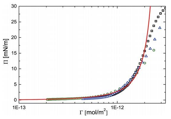 圖2表面壓力(P)與空氣-水界面上PNIPAM顆粒吸附量(G)的關系。開放符號表示與三組不同實驗相對應的實驗數據點,即:(,)具有高初始顆粒負荷的NIMA槽,(B)具有低初始顆粒負荷的NIMA槽和(D)具有高初始顆粒負荷的Kibron m槽。紅色實線表示使用Groot和Stoyanov模型進行的預測。