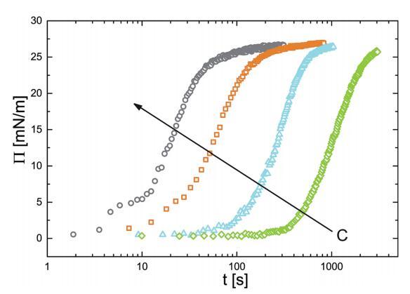 在建立了一個狀態方程來關聯表面壓力和吸附量之后,我們現在開始研究粒子的吸附動力學。為此,我們監測了PNIPAM顆粒懸浮液中新制備氣泡的界面張力隨時間的變化。我們將界面張力值轉換為表面壓力。結果如圖4所示。表面壓力值最初迅速增加,然后放松到最終平衡值。動力學可以清楚地分為兩個獨立的時間尺度:一個是表面壓力值增加表示的初始快速動力學,另一個是系統向最終平衡狀態松弛時的緩慢部分。短時間快速動力學和長時間慢得多動力學之間的區別是許多表面活性材料吸附行為的特征。32,33