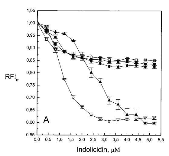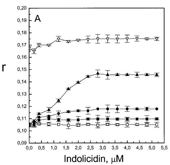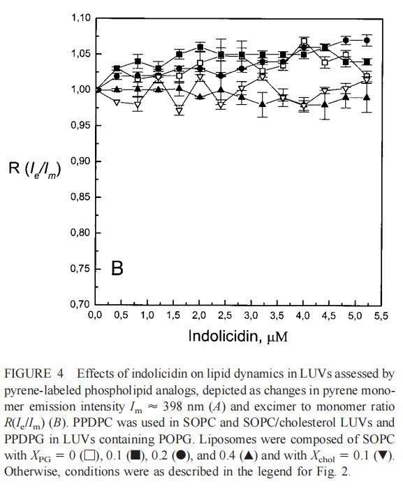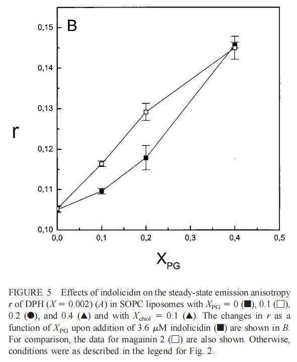 與magainin 2類似,吲哚青霉素與陰離子和兩性離子囊泡的膜結合非常不同(圖1b、4和5),與先前的平衡透析研究一致(Ladokhin et al.,1997)。雖然芘熒光的猝滅顯示吲哚肽被分配到SOPC雙層中,但對膜?;滍樞驇缀鯖]有影響(圖5)。相反,吲哚西啶與陰離子膜的相互作用導致脂酰鏈順序增加,明顯表現為DPH熒光各向異性增加,并對XPG呈S形依賴(圖5)。與magainin 2相反,吲哚西丁導致芘單體和準分子發射強度顯著平行降低,與脂質成分無關,Ie/Im變化較?。▓D4)。相應地,吲哚西丁誘導酸性PG富集到微區。有趣的是,在吲哚西丁/脂質摩爾比為1:20以下,芘Im的減少順序為XPG=0.40.20.10(圖4a),而在吲哚西丁/脂質摩爾比為1:10時,Im的減少對XPG的依賴性相反。這種變化的可能機制如下。在低肽/脂摩爾比時,吲哚西丁似乎被調節到雙層界面(Ladokhin等人,1997),芘標記鏈的鏈反轉(Holopainen等人,1999)使該部分更接近雙層表面,從而允許其與吲哚西丁的基本殘基接觸。后者通過π-陽離子相互作用導致芘部分的碰撞猝滅。然而,隨著XPG的增加,我們可以預期PG頭基與吲哚西丁的堿性殘基發生靜電結合,從而阻止芘與吲哚西丁的陽離子殘基之間的直接接觸。隨著肽濃度的增加,吲哚肽的膜結合以協同方式增強,猝滅效率的逆轉可能涉及雙分子層中脂肽復合物的聚集。因此,在酸性含磷脂的膜中,吲哚對芘的猝滅作用較小。當吲哚肽的濃度增加到肽/脂比1:10以上時,肽將以高度協同的方式并入膜的?;渽^域(Ha等人,2000)(圖9 E),而在中性膜中,肽位于界面(圖9 D)。插入吲哚西丁的量取決于雙層中的XPG,導致吲哚西丁的Trp殘基的猝滅占主導地位,與XPG=0.4時Im的顯著減少一致(圖4a)。