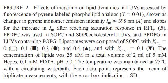 繼上述單層研究之后,有興趣探索肽對脂質動力學的影響。這是通過使用熒光光譜和不同脂質成分的LUV完成的,記錄芘標記的熒光磷脂類似物PPDPC或PPDPG的發射光譜(均為X=0.01)。對于SOPC LUV,添加magainin 2導致芘熒光顯著猝滅,芘單體和準分子發射強度平行降低,如Im所示(圖2)。作為XPG的一項功能,還研究了馬蓋寧2與脂質體結合的后果。當XPG從0.1增加到0.4時,觀察到由于magainin 2在398 nm處逐漸增強的Im(RFIm),而Im的初始增量在明確定義的PG/magainin 2化學計量比~2、3和5時趨于平穩(圖2 A)。在這個初始階段之后,直到給定的化學計量比,還有第二個過程,其斜率也隨著XPG的增加而增加(圖2b)。在XPG=0和0.1時,Magainin 2僅引起Ie/Im的輕微變化,而在XPG=0.2和0.4時,分別減少10%和25%是明顯的(圖3 A)。為了區分脂質動力學中兩種性質不同的變化,即側向遷移率和微結構域形成,作為上述Ie/Im變化的根本原因,我們還通過測量DPH的熒光各向異性r來評估酰基鏈順序的變化(圖3 B)。在缺乏酸性磷脂的情況下,Magainin 2幾乎不會引起r的變化(圖3B)。然而,隨著XPG的增加,加入magainin 2后脂質堆積和酰基鏈順序逐漸增加(圖3b),XPG=0.4時,r最大增加1.4倍。值得注意的是,XPG=0.1時Ie/Im沒有變化以及?;滍樞虻脑黾颖砻鱌PDPG正在發生微觀富集。有趣的是,在存在膽固醇(Xchol=0.1)的情況下,由于馬蓋寧2的作用,Im和Ie都顯著降低,Ie/Im的變化不顯著(圖2A和3A)。如前所述(van Ginkel et al.,1989),添加肽前r的增加(圖3 B)揭示了通過在膜中摻入膽固醇而增強的膜順序。然而,在膽固醇存在的情況下,magainin 2對r沒有進一步的影響(Xchol=0.1,圖3b)。