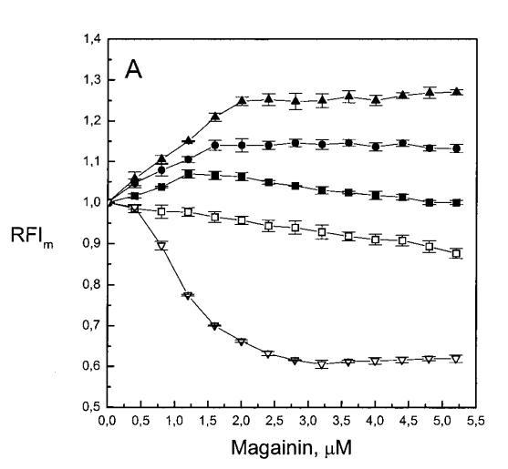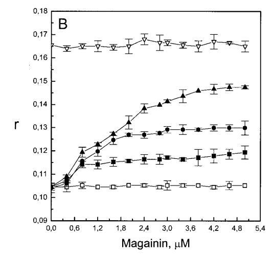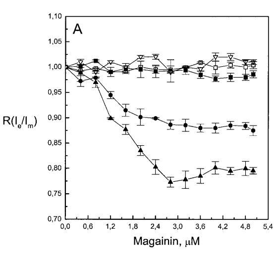 有趣的是,在存在酸性磷脂的情況下,肌動蛋白/脂質的摩爾比(在該摩爾比下,肌動蛋白的初始增量趨于穩定)分別為1:21、1:16和1:12.5,對應于XPG=0.1、0.2和0.4(圖2A),分別產生1:2、1:3和1:5的肌動蛋白/磷脂化學計量比。同時,DPH的初始r增量在magainin/脂質摩爾比為~1:30、1:12和1:5時趨于平穩(XPG分別為0.1、0.2和0.4),對應于大約1:3、1:2.5和1:2的magainin/PG化學計量比(圖3)。據報道,在這些肽/脂質摩爾比下,magainin可插入含酸性磷脂的膜中(Ludtke等人,1994年)。此外,已經證明,雙分子層中magainin的=-螺旋的方向取決于肽與脂質的摩爾比,在上述化學計量比下,螺旋應垂直于膜表面插入,在含PG的膜中形成孔(Ludtke等人,1996)。這些孔不僅由兩親螺旋的極性面組成,而且還由脂質的極性頭基組成,內外單層通過這些孔襯脂質是連續的。膜中的這種結構可能會降低探針芘部分微環境的極性,從而提高其量子產率。有趣的是,當XPG>0.1時,magainin 2逐漸降低Ie/Im值(圖3 A),這與增強的?;滍樞驕p少脂質側向擴散的速率一致。然而,由于magainin 2已經在XPG=0.1時增加了r,Ie/Im沒有變化,我們可以得出結論,PPDPG探針向微區富集以及其橫向擴散的減少正在發生。