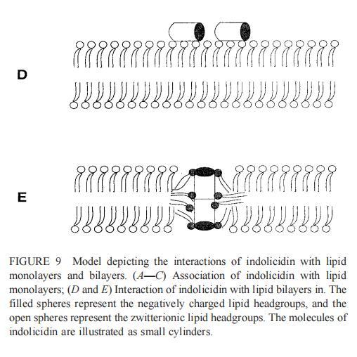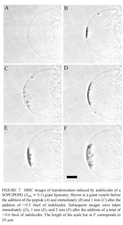 吲哚西丁只含有13個氨基酸,因此太短,無法跨越雙層。然而,該肽可以作為聚集物或帶有相關酸性磷脂的頭尾二聚體橫跨雙層(圖9 E),從而導致膜不穩定性。已經證明,吲哚西丁能夠通過穿過外膜殺死革蘭氏陰性細菌,并通過形成通道破壞細胞質膜(Falla et al.,1996)。與magainin 2的作用相比,吲哚青霉素誘導的內吞小泡較?。▓D7)可能反映了這些肽與脂質相互作用的不同模式。一些吲哚肽分子可能會轉移到膜的內部小葉中。除了具有廣譜的抗真菌和抗菌活性外,吲哚西丁對哺乳動物細胞也有毒性(Schluesener等人,1993年;Ahmad等人,1995年)。有趣的是,吲哚西丁對SOPC和SOPC膽固醇巨型脂質體的作用不同。在這一階段,根本原因尚不確定,可能與膽固醇對雙層結構以及吲哚肽在膜中的取向的影響有關。因此,需要進一步的研究來闡明膽固醇對吲哚肽膜結合的影響。
