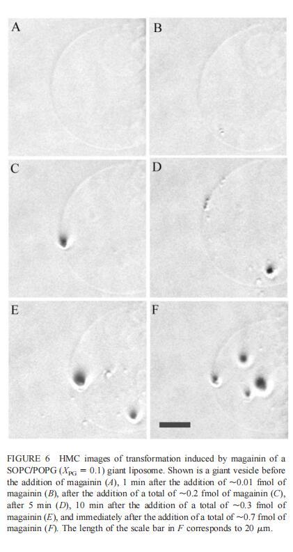 由于上述magainin 2和吲哚西啶對單層和LUV具有明顯的脂質成分依賴性作用,因此有興趣使用巨型脂質體比較這些肽對宏觀膜的三維拓撲結構的影響,無論是否含有PG,都可以在交流電場中形成由SOPC組成的巨大脂質體。即使暴露于大量肽(~2 fmol,~4 pl=200次重復注射,數據未顯示),SOPC膜也不受magainin 2的影響。同樣,由SOPC和膽固醇(Xchol=0.1)組成的巨大脂質體也不受此量的馬蓋寧2的影響(數據未顯示)。然而,在存在POPG(XPG=0.1)的情況下,已經~0.01 fmol(單次~20 fl注射)的magainin 2應用于巨大囊泡表面,顯著影響巨大脂質體膜的拓撲結構(圖6 B)。更具體地說,在~1分鐘內,小顆粒(θ≈0.9米)出現在巨大的囊泡內。隨后注射高達~0.1 fmol(約200 fl)的magainin 2不會引起進一步的可見變化。在總共添加約0.2 fmol的肽后,膜開始起伏,形成致密顆粒(θ≈4 m)在巨大脂質體內可見(圖6 C)。在~5分鐘內,幾個小顆粒(θ≈0.9 m)出現在巨大脂質體膜的內表面(圖6 D)。隨后,大多數小顆粒進入巨大囊泡的內腔。這些內吞小泡似乎在巨大脂質體內自由移動,在隨后30分鐘的觀察中沒有進一步的變化。進一步注射magainin 2,提供總共0.3 fmol的肽,引起類似內吞作用的過程,出現直徑約8 m的致密顆粒(圖6 E)。約10分鐘后,巨大脂質體內約0.9-m顆粒的數量繼續增加。偶爾,這些顆粒也出現在巨大囊泡的外表面,并釋放到外部緩沖液中(圖6 E)。隨后添加magainin 2(~0.7 fmol)使膜不穩定并誘導進一步的囊泡形成(圖6 F)。這些內吞囊泡在巨大脂質體內彼此分離,巨大囊泡的大小明顯減?。▓D6f)。最終,在進一步添加magainin 2(高達~1.5 fmol)后,巨大的脂質體膜崩塌。上述形態學變化具有高度的可重復性。