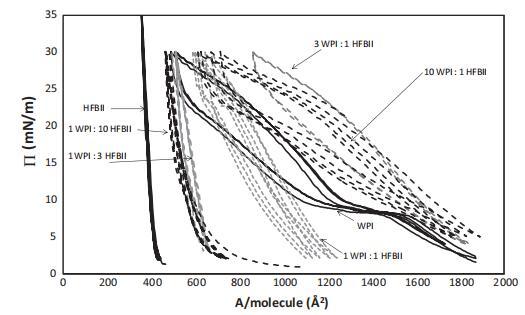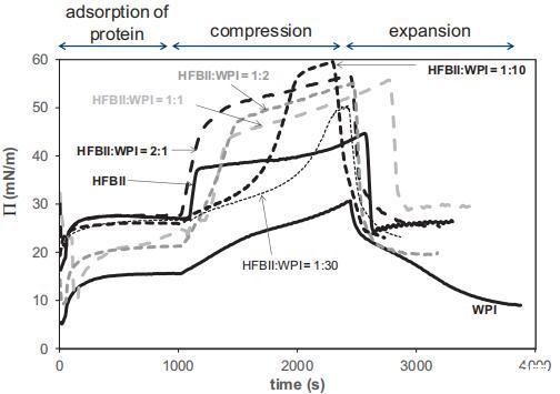 值得注意的是,對(duì)于純HFBII,П–A等溫線在連續(xù)的壓縮膨脹循環(huán)中不會(huì)發(fā)生變化,這再次表明HFBII不可撤銷(xiāo)地附著在界面上,幾乎沒(méi)有任何構(gòu)象變化。對(duì)于純WPI和1:1混合物,П–A等溫線略微向較小區(qū)域移動(dòng),這表明由于WPI分子的構(gòu)象變化、多層形成或如前所述,由于WPI的解吸,表面重排的可能性較小。