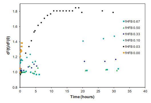 氣泡尺寸隨時(shí)間的相對(duì)增加如圖9所示,表示為d2(t)/d2(0)。考慮到環(huán)境充氣樣品的泡沫穩(wěn)定性,對(duì)于純HFBII系統(tǒng),在本實(shí)驗(yàn)期間未發(fā)現(xiàn)平均氣泡尺寸的顯著變化,表明幾乎不可能發(fā)生任何歧化。在純WPI的情況下,可以發(fā)現(xiàn)氣泡尺寸急劇增加,表明對(duì)歧化的穩(wěn)定性較差。在混合情況下,隨著fHFBII的增加,我們可以看到氣泡尺寸穩(wěn)定性增加的趨勢(shì)。我們可以粗略地說(shuō),當(dāng)fHFBII<0.2時(shí),氣泡大小的初始演化在很大程度上取決于WPI。然而,當(dāng)fHFBII>0.2時(shí),HFBII的存在控制泡沫穩(wěn)定性。這與在朗繆爾槽中觀察到的初始?xì)馀荽笮『臀綄拥内厔?shì)非常一致。