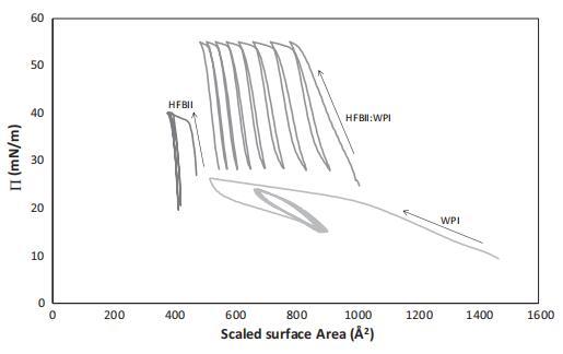 圖4。?/A-純HFBII、純WPI及其1:10混合物的吸附系統(tǒng)的等溫線,所有這些系統(tǒng)的總蛋白質(zhì)濃度均為0.1 mg/ml。等溫線包括第一個(gè)壓縮/膨脹循環(huán)和5個(gè)滯后環(huán)。將HFBII和WPI的表面積縮放至攤鋪系統(tǒng)曲線中彎曲點(diǎn)的出現(xiàn),對(duì)應(yīng)于表面的明顯緊密堆積過(guò)渡(圖1)。