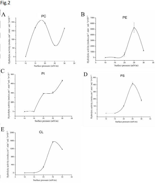 圖2示出了使用各種磷脂作為水解底物獲得的詳細(xì)活性-表面壓力曲線。可以看出,酶的水解活性高度依賴于表面壓力。然而,每種底物的活性曲線不同。發(fā)現(xiàn)基板PE、PS和CL的鐘形曲線具有特征性的最佳表面壓力值(圖2B、D、E)。在低于15 mN/m的表面壓力下,未檢測到基本酶活性。水解活性隨表面壓力的增加而增加。在25 mN/m的表面壓力下,觀察到PE、PS和CL的最大活性。然而,當(dāng)表面壓力高于25 mN/m時,所有這些磷脂的水解活性降低。與所有測試的底物相比,在25 mN/m的表面壓力下,PE的水解率最高,水解活性達(dá)到5272.31×10-11摩爾。cm-2。最小-1。mL-1。對于PI,在15 mN/m以下也沒有觀察到水解速率,但是,沒有觀察到鐘形曲線,并且隨著表面壓力從15 mN/m增加到30 mN/m,活性增強(qiáng)(圖2C)。對于PC,從10 mN/m到25 mN/m觀察到鐘形曲線,但在30 mN/m的表面壓力下,活性進(jìn)一步增加。隨著表面壓力從25 mN/m增加到30 mN/m,表面輪廓上的單層構(gòu)象可能發(fā)生了變化,導(dǎo)致活性增加。在本實(shí)驗(yàn)中,在測試的表面壓力范圍內(nèi),SM沒有活性。從π-A曲線可以看出,在25 mN/m的表面壓力下測試的所有磷脂都處于液態(tài)冷凝狀態(tài),沒有達(dá)到各自的坍塌壓力。在這種情況下,超卵磷脂酶對不同單分子磷脂膜的偏好順序?yàn)镻E>CL>PS>PI>PC。在這些條件下,SM沒有活性。Lecitase Ultra選擇性的詳細(xì)機(jī)制仍需闡明。