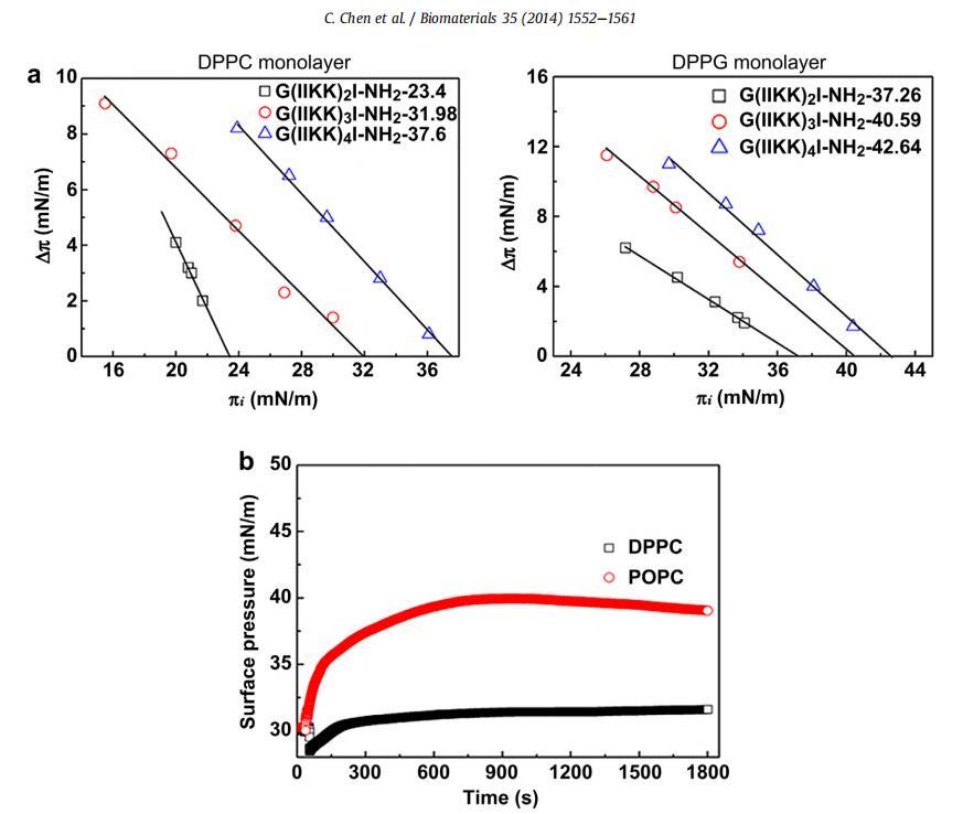 在這個階段,這些肽的選擇性背后的機制過程在很大程度上仍不清楚,但抗癌肽主要是膜活性的,它們對癌細胞的作用方式涉及膜破壞。此外,它們對癌細胞的選擇性殺傷與癌細胞的兩個關鍵細胞膜特征密切相關,即凈負表面電荷和更大的膜流動性[2,3,16]。為了了解肽和細胞膜之間的特殊相互作用以及分子水平上抗癌作用的基本過程,我們轉向使用脂質單層的膜模型。圖2a顯示了在最終濃度為3 mM的條件下,將G(IIKK)(2e4)I-NH2注入亞相時,DPPC(二棕櫚酰磷脂酰膽堿)和DPPG單層(分別模擬正常哺乳動物宿主細胞和癌細胞外膜)的表面壓力從不同的初始表面壓力(pi)增加(Dp),同時保持表面積不變。所有的肽都表現出對帶負電荷的DPPG單層的明顯偏好,而對兩性離子DPPC單層的親和力則要小得多。在Dp?0處對每個壓力圖進行外推,得出排除壓力,超過該壓力,肽不再能夠穿透脂質單層,從而導致表面壓力進一步增加。對于兩性離子DPPC單層,G(IIKK)2I-NH2的排斥壓力為23.4 mN/m,遠低于生物膜的30e35 mN/m生理范圍[17,18],這與其對紅細胞的毒性很小相符。相比之下,G(IIKK)(3e4)I-NH2的值分別增加到32.0和37.6 mN/m,這與它們的溶血活性增加一致。另一方面,對于帶負電荷的DPPG單層,排斥壓力分別顯著增加至37.3、40.6和42.6 mN/m,表明陽離子肽電荷和陰離子脂質頭基團之間的靜電相互作用起著關鍵作用。盡管DPPC和DPPG單分子膜對G(IIKK)2I-NH2的排斥壓差較大(參見補充數據,圖S1),但其對后者的排斥壓僅略高于生物膜30e 35 mN/m的生理范圍,這與其殺死癌細胞的效率較低一致,因此,這種肽在癌癥治療中沒有吸引力。另一方面,G(IIKK)4I-NH2對兩性離子DPPC單分子膜的排斥壓力為37.6 mN/m,略高于30e35 mN/m的生理范圍,這與該系列中表現出的最高溶血能力一致。G(IIKK)3I-NH2顯示出中間值,DPPC單層的Dp值為32.0 mN/m,DPPG單層的Dp值為40.6 mN/m,這與體外細胞工作中的最佳細胞選擇性一致。