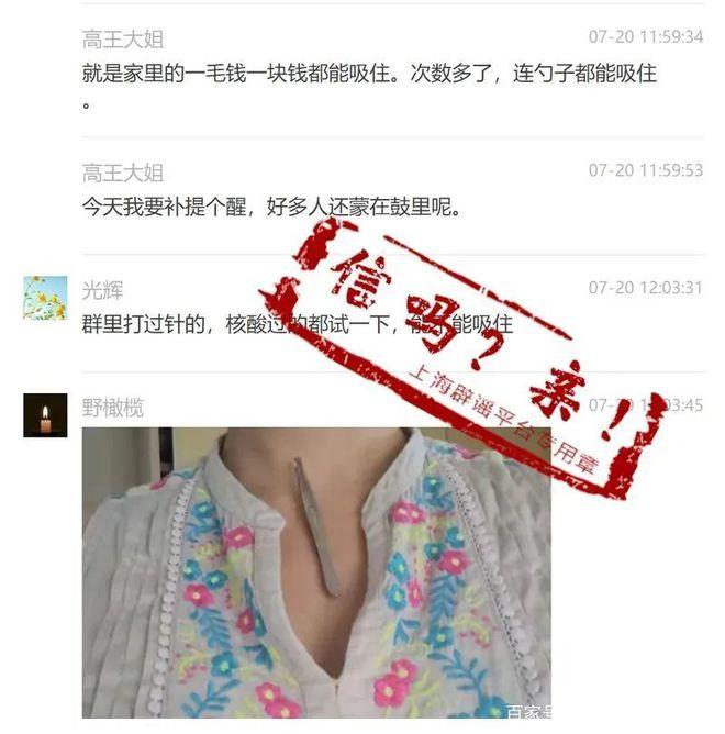近日,多條“做完核酸檢測身體變磁鐵”的消息在微信群中流傳,有人稱廣東一女子做完核酸檢測一個星期之內,身體吸住了金屬!根據這些消息,有人稱“以后不要再做核酸檢測了,越做身上‘磁’越多”,甚至有人號召大家拒絕做核酸檢測。