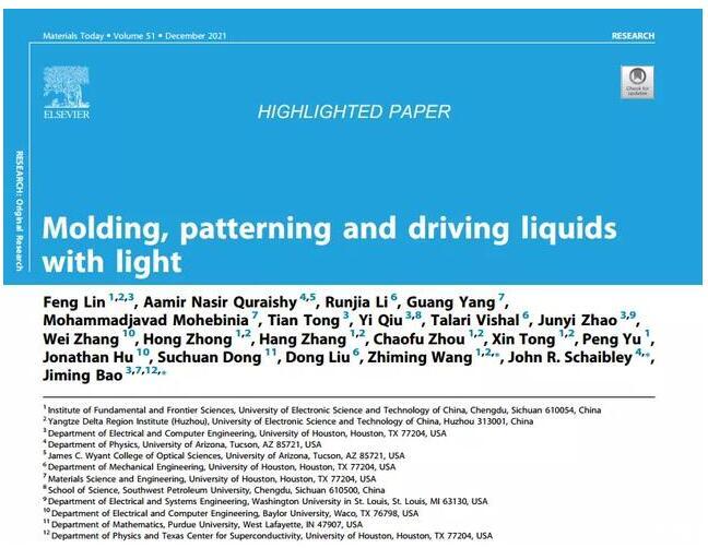 該論文以電子科技大學(xué)第一單位發(fā)表在國(guó)際頂級(jí)期刊Materials Today上,并被期刊主編選為Highlighted paper作為亮點(diǎn)工作報(bào)道,論文題為《光驅(qū)動(dòng)液體塑模、繪畫和運(yùn)動(dòng)》(Molding,patterning and driving liquids with light)[1]。