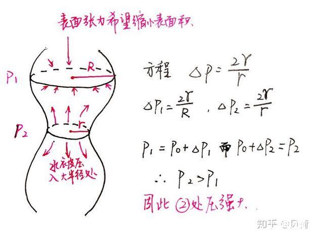表面張力會(huì)像皮筋一樣收縮液體的表面積,同時(shí)壓力大(半徑小)的地方的水被擠到半徑大的地方,使得本來細(xì)的地方半徑變得更小。