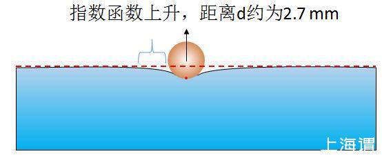 我們由水面上兩個(gè)球形的物體做理想分析,現(xiàn)在先看親水的球形的物體在水面上使水面升高的情形。如圖1所示,親水物體由于其毛細(xì)作用,附近水面上升,不過(guò)水面升高后以指數(shù)函數(shù)在兩側(cè)下降,其影響距離大致為毛細(xì)作用力的距離,即2.7 mm。大于2.7 mm時(shí),重力與表面張力相比重力占據(jù)主導(dǎo)地位,液面幾乎不再上升。