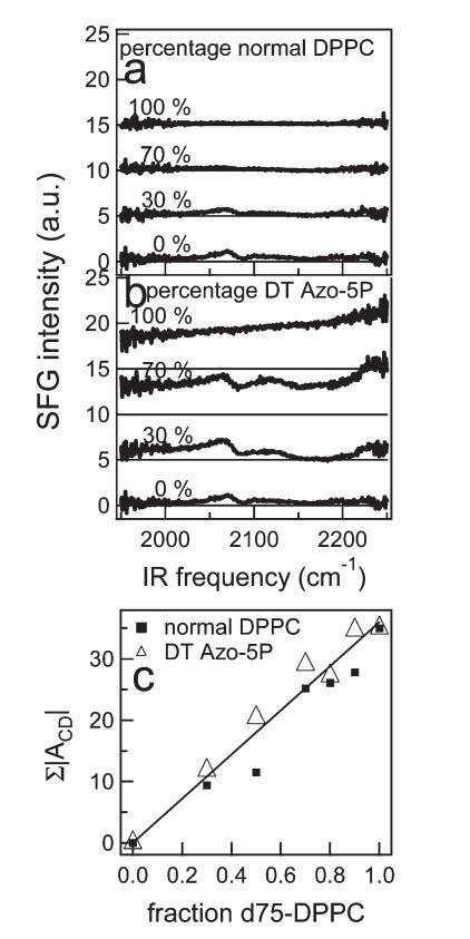 圖9:。(a)正常DPPC和d75 DPPC不同混合物的CD區(qū)VSFG光譜。圖中給出了混合物中正常DPPC的百分比。為清晰起見(jiàn),光譜偏移,細(xì)線表示零。(b)與a部分類似,但適用于DT Azo-5P與d75 DPPC的混合物。(c)通過(guò)擬合VSFG光譜獲得的CD振動(dòng)振幅之和,如文中所述,作為含正常DPPC或DT Azo-5P的二元混合物中分?jǐn)?shù)d75 DPPC的函數(shù)。在本實(shí)驗(yàn)中,為了獲得混合物的高質(zhì)量數(shù)據(jù),紅外注量很高,導(dǎo)致通過(guò)VSFG光譜中相對(duì)較高的CH2和CD2振幅觀察到的脂質(zhì)尾部出現(xiàn)小的無(wú)序。