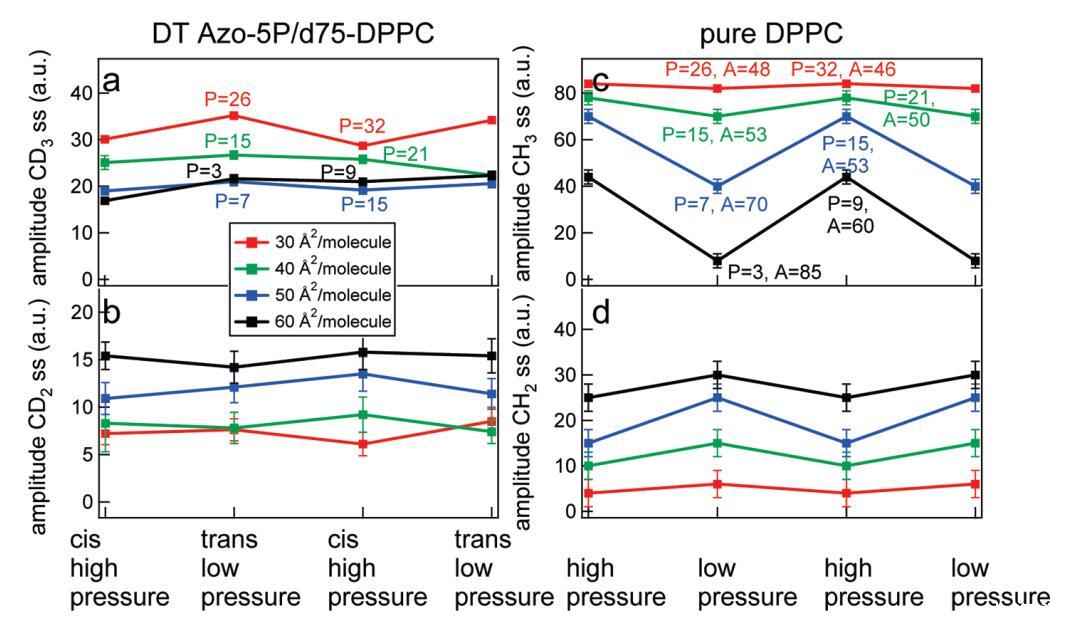 圖8:。d75 DPPC與DT Azo-5P比例為5:1的實(shí)驗(yàn)中d75 DPPC的擬合結(jié)果(左)和純正常DPPC的擬合結(jié)果(右)。(a)CD3對(duì)稱拉伸振動(dòng)模式的振幅隨不同密度光開(kāi)關(guān)脂質(zhì)狀態(tài)的變化;(b)CD2對(duì)稱拉伸振動(dòng)模式的振幅隨不同密度光開(kāi)關(guān)脂質(zhì)狀態(tài)的變化;右圖顯示了純DPPC在可比壓力下與左圖相似的結(jié)果,其中(c)為CH3對(duì)稱拉伸振動(dòng)模式的振幅,(d)為CH2對(duì)稱拉伸模式的振幅。共振的寬度和頻率在擬合中是固定的。