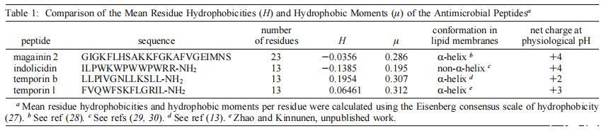 我們的長期目標是建立最低的序列要求,這可以進一步作為設計新型抗菌肽類似物的指導原則。我們之前已經比較了兩種抗菌肽,馬蓋寧2和吲哚肽對本研究中使用的相同模型膜系統的影響,即。,單層、脂質體和巨大囊泡(15)。我們早期研究中使用的肽是選擇的,因為它們代表兩種不同類型的抗菌肽家族。在本研究中,我們使用了兩種13個氨基酸的肽,即與吲哚肽長度相似的肽。肽的結構參數不同,如電荷、構象、疏水性、疏水力矩和大小(表1)。有趣的是,在所研究的四種肽中,以摩爾為基礎計算的時間蛋白L最有效,作用于中性和酸性磷脂膜。與其他三種肽相比,其凈陽離子電荷和疏水性具有平均值(表1)。然而,在所示的肽中,temporin L具有最高的平均疏水力矩,這表明這可能是與其有效的膜擾動作用相關的一個重要參數,這與之前比較magainin 2和其他抗菌肽的研究一致(31)。