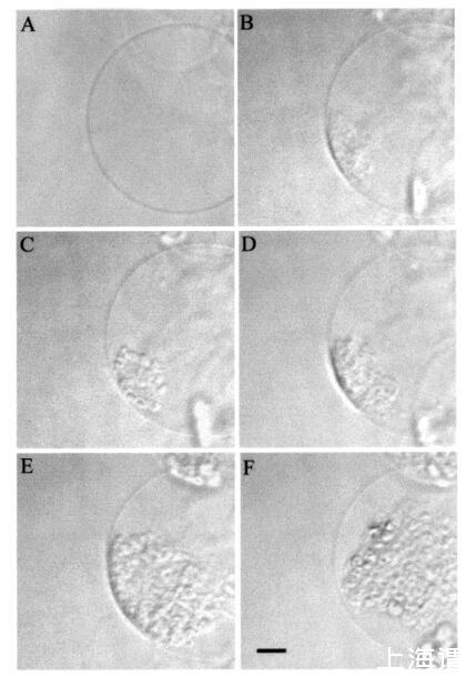 圖8:HMC圖像,描繪了應用temporin L之前以及添加temporin L后立即(面板B)、1秒(面板C)由temporin L.巨大囊泡誘導的巨大SOPC/POPG(XPOPG)0.1)脂質體的轉化≈12 amol Temporain L,并在添加后立即(面板D)≈24 amol的顳葉素L。在注射了總計≈36 amol(E組)的temporin L,以及在添加總計≈60 amol temporin L。面板F中比例尺的長度對應于50μm。