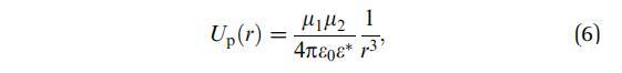 其中Ai表示域i的面積,dai表示其面積元素,-ri表示其相對(duì)于域中心的位置向量,i=1,2-r是從域1中心到域2中心的向量,如圖1所示。e0是真空介電常數(shù),ew和ea分別是水和空氣的相對(duì)介電常數(shù)。在這里,我們使用了Urbakh等人21的研究結(jié)果,該研究描述了由兩個(gè)半無(wú)限介質(zhì)包圍的薄電介質(zhì)層中偶極子之間的相互作用。