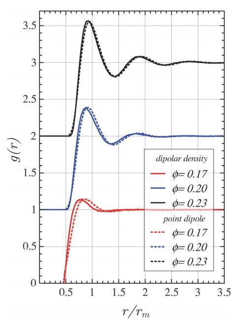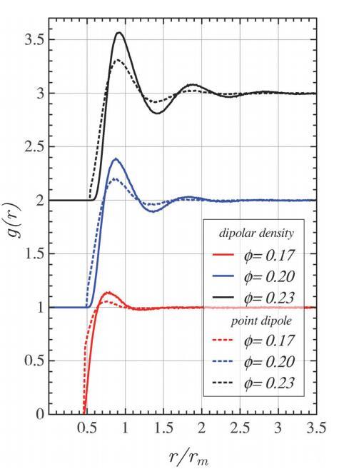 在第一個峰值位置和g(r)開始偏離零的小區(qū)域觀察到輕微差異。當系統(tǒng)更加結(jié)構(gòu)化時,協(xié)議會得到改善。特別是,對于弱相互作用域,差異開始明顯。這些偏差是由于點偶極力在接觸時趨于有限值,而在偶極密度情況下,它會發(fā)散。因此,硬盤相互作用與點偶極子模型有關(guān)。