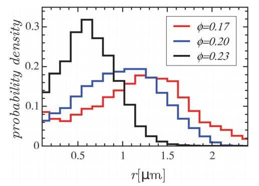 圖4具有不同凝聚面積分數(shù)的單分子膜的域半徑分布。