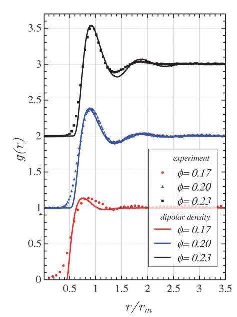 我們還研究了點偶極子模型,以探討其作為偶極密度模型近似值的有效性。通過分析徑向分布函數(shù),我們發(fā)現(xiàn)點偶極子模型嚴重低估了結(jié)構(gòu)。然而,如果將點偶極子強度視為擬合參數(shù),即有效相互作用強度,則可以實現(xiàn)良好的一致性。對于不同的面積分數(shù),我們確定了f0的廣泛范圍內(nèi)的f p0。模型之間的這種關(guān)系允許使用更簡單的點偶極模型來計算具有已知偶極斥力的單層的結(jié)構(gòu),并從實驗g(r)中獲得偶極斥力。