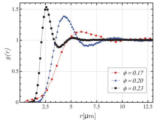 圖5顯示了三個實驗系統(tǒng)的徑向分布函數(shù)。在所有情況下,g(r)類似于液體,顯示出明確的第一峰(在rmax處),其表征了第一配位殼層,即最近鄰。此外,對于f=0.20和f=0.23的系統(tǒng),觀察到與第二配位殼對應(yīng)的標記的第一最小值和第二最大值。由于“強”排斥作用,最近鄰距離遠大于平均磁疇直徑。因此,硬核斥力不是結(jié)構(gòu)的決定因素,系統(tǒng)的特征長度是平均幾何距離rm=r 1/2。
