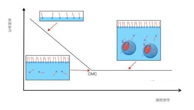 但是當(dāng)濃度超過一個點時,表面活性劑會開始抱團,形成膠束,界面張力不再下降,這個濃度叫做臨界膠束濃度。