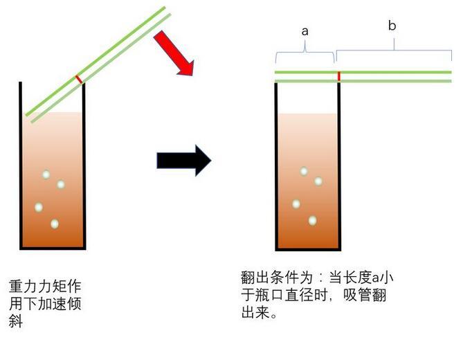 達(dá)到位置最高時(shí),速度為零,這時(shí),重力大于浮力,重力矩的作用下,加速傾斜。那么什么情形下,吸管會翻出來呢?顯然是吸管翻出時(shí),不被瓶壁阻擋時(shí),才可以翻出來。