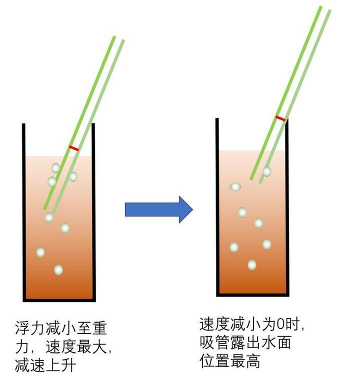 這時(shí)上升過程中,吸管可能因?yàn)樽笥覂蓚?cè)吸附的氣泡數(shù)量不同而發(fā)生浮力差異而傾斜。也可能因?yàn)橥饨鐢_動而發(fā)生傾斜,反正吸管豎直上升的可能性很小。習(xí)慣傾斜碰到瓶壁后繼續(xù)上升,上升帶來氣泡的減少,吸管自身浮力的下降。當(dāng)浮力減小到小于重力時(shí),這時(shí)開始i減速,直到速度為零。如下圖所示;