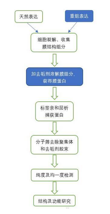 藍色背景分別是表達系統與去垢劑的選擇,是整個流程中至關重要的步驟。