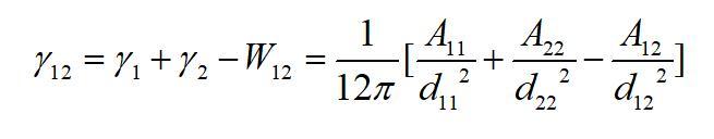為物質1的Hamaker常數。該作用勢能就相當于本體的內聚功。從表面自由能的定義不難看出,當將本體沿本體內的一個界面分開時,單位面積需要克服內聚力所做的功就等于這個作用勢能。由于分開后形成兩個新表面,因此每個表面上的勢能等于該勢能的一半。因此物體的表面自由能(表面張力)也等于該作用勢能的一半,即