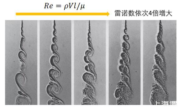 隨著雷諾實驗和雷諾數(shù)被提出來以后,近代流體力學(xué),尤其是湍流理論的發(fā)展出現(xiàn)了一個前所未有的盛況,而粘性與湍流的關(guān)系也順理成章的轉(zhuǎn)化成了雷諾數(shù)和湍流的關(guān)系。1974年刊登于《流體力學(xué)》期刊中的一篇經(jīng)典文章,通過流動顯示技術(shù)生動形象的描繪了雷諾數(shù)和流態(tài)的關(guān)系:隨著雷諾數(shù)的增大,渦旋的整體形狀和尺度基本一致,然而射流摻混的渦系結(jié)構(gòu)卻越來越豐富。
