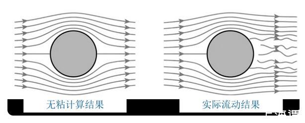 歐拉提出歐拉方程后不久,人們就認識到方程中缺乏粘性項,這會導(dǎo)致歐拉方程的計算結(jié)果和實際產(chǎn)生偏差,比如大家熟知的達朗貝爾佯謬。下圖顯示了理想流體和實際流體下圓柱繞流的對比,可以看出,無粘流動的結(jié)果和實際存在很大的差異。因此,如何在流動方程中添加粘性項成為了跨越百年的流體力學(xué)難題。