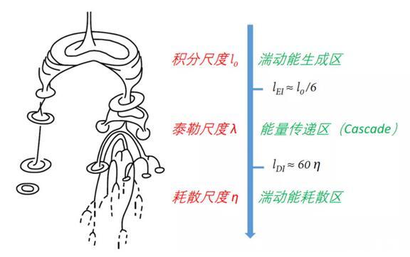 而之所以會出現(xiàn)上圖中的有趣現(xiàn)象,則要牽扯到湍流的生成、傳遞及耗散:湍流中的大渦會破碎為小渦,小渦再破碎為更小的“迷你渦”,然后逐漸耗散,這個過程與當(dāng)?shù)乩字Z數(shù)相關(guān)。當(dāng)“迷你渦”變得足夠小時,根據(jù)角動量守恒,渦的角速度將會非常大,意味著局部速度剪切很強,粘性就變得舉足輕重了,于是,“迷你渦”就這樣被粘性耗散掉了。事實上,渦的尺度足夠小時,體現(xiàn)為當(dāng)?shù)乩字Z數(shù)非常小,粘性力對流體的影響則顯著大于慣性力。