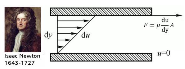 正如前面所說,人們很早便感受到了流體具有“粘”的屬性,但是如何從科學(xué)上表達流體的粘性成為了一個新的問題。作為世界物理學(xué)界金字塔尖的男人,牛頓幾乎霸屏了整個中學(xué)物理課本,當(dāng)然也沒有放過流體。1686年,牛頓經(jīng)過大量的實驗研究,提出了著名的“內(nèi)摩擦定律”——流體的內(nèi)摩擦力(即粘性力)的大小與流體的性質(zhì)(粘性系數(shù)μ)有關(guān),并與流體的速度梯度和接觸面積成正比。