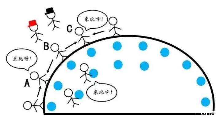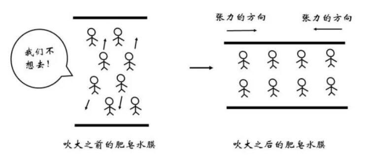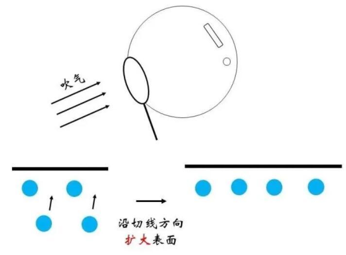 俗話說(shuō)“物以類(lèi)聚,人以群分”,更加相似的同類(lèi)分子間往往關(guān)系更為融洽,而不同種分子間的關(guān)系則相對(duì)疏遠(yuǎn)。在物理上表現(xiàn)為同類(lèi)分子間的勢(shì)能曲線最低點(diǎn)更低。因此,對(duì)于一個(gè)存在于內(nèi)部的水分子,如果來(lái)到表面,需要斷開(kāi)與同類(lèi)分子的部分關(guān)系,而代之以與比較“生疏”的空氣分子間的作用,顯然是不情愿的!這體現(xiàn)為能量的升高。那么,什么情況下水分子要從內(nèi)部來(lái)到表面呢?正是吹泡泡的時(shí)候。