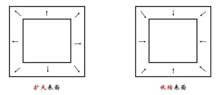 那么表面張力的方向是什么呢?我們同樣類(lèi)比重力、彈力等力。簡(jiǎn)單回顧不難發(fā)現(xiàn),如果將表面張力理解為單位面積形變引起的能量升高,那么對(duì)應(yīng)的力應(yīng)該指向使得能量降低的方向。對(duì)于表面張力,自然就是沿切線使得表面收縮的方向。