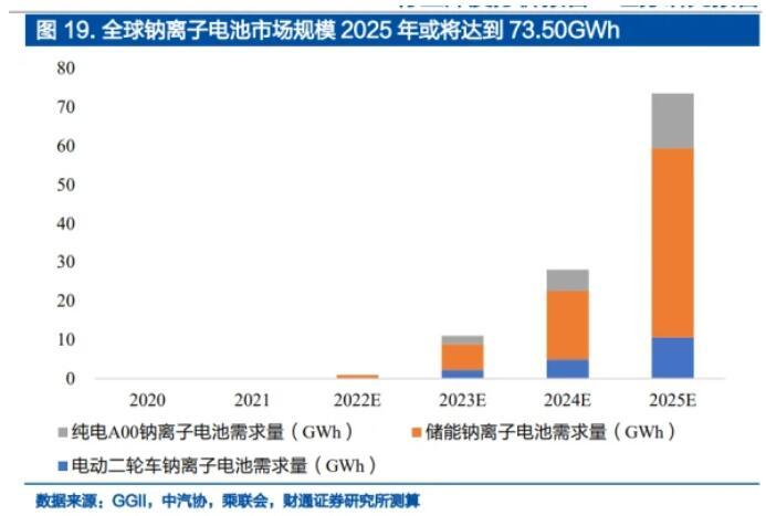 我們預(yù)計(jì)2025年鈉離子電池市場規(guī)模為398億元,2022-2025年年復(fù)合增速超300%,市場需求直接從21年0GWh增長到25年的73.50GWh。其中,電動(dòng)二輪車領(lǐng)域,鈉離子電池需求規(guī)模從2021年的0GWh增長到2025年的10.63GWh;儲(chǔ)能領(lǐng)域,鈉離子電池需求規(guī)模從2021年的0GWh增長到2025年的48.74GWh;純電A00領(lǐng)域,鈉離子電池需求規(guī)模從2021年的0GWh增長到2025年的14.13GWh。