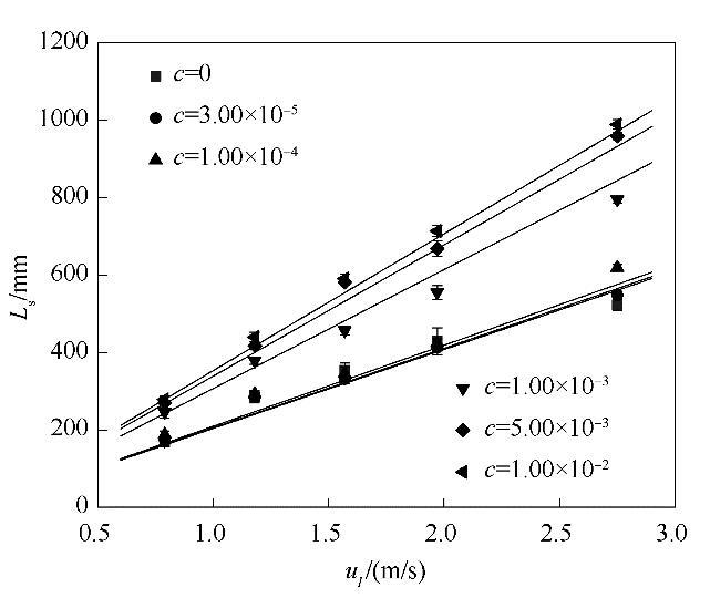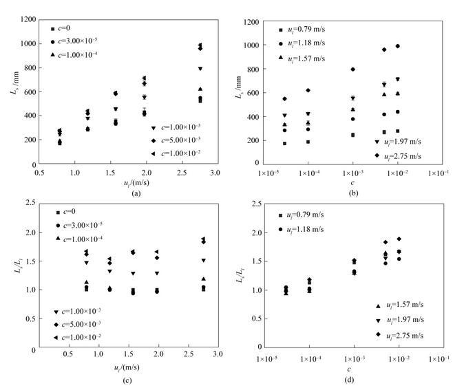 為了定量表征表面張力變化對射流破裂過程的影響,實驗測量了含表面活性劑射流的射流破裂長度。射流破裂長度定義為噴嘴出口至射流首次發(fā)生破裂處的距離。圖6是含表面活性劑射流破裂長度隨射流速度u l的變化趨勢,其中L s(mm)表示含表面活性劑射流的射流破裂長度,L l(mm)為水的射流破裂長度。從圖6(a)中可以看出,當表面活性劑濃度保持不變時,提高液體射流速度會增大射流破裂長度。從圖6(b)中可以看出,當液體射流速度保持不變時,隨著表面活性劑濃度的增大,射流破裂長度總體上呈現(xiàn)逐漸增大的趨勢;射流速度越大,射流破裂長度增大的趨勢就越明顯。使用相同工況下水的射流破裂長度無量綱化含表面活性劑射流的破裂長度后,可以得到射流破裂長度比隨射流速度以及表面活性劑濃度的變化趨勢,如圖6(c)、(d)所示。從圖中可以看出,表面活性劑的加入顯著增大了射流破裂長度比。在表面活性劑濃度不變時,提高液體射流速度對射流破裂長度比的影響并不顯著。在射流速度保持不變時,提高表面活性劑濃度會導致射流破裂長度比的增大。