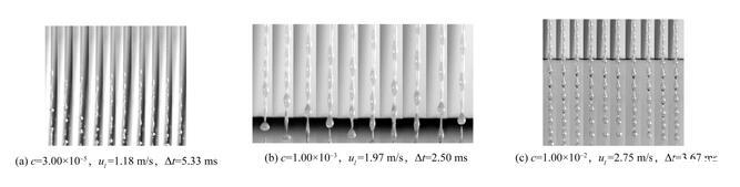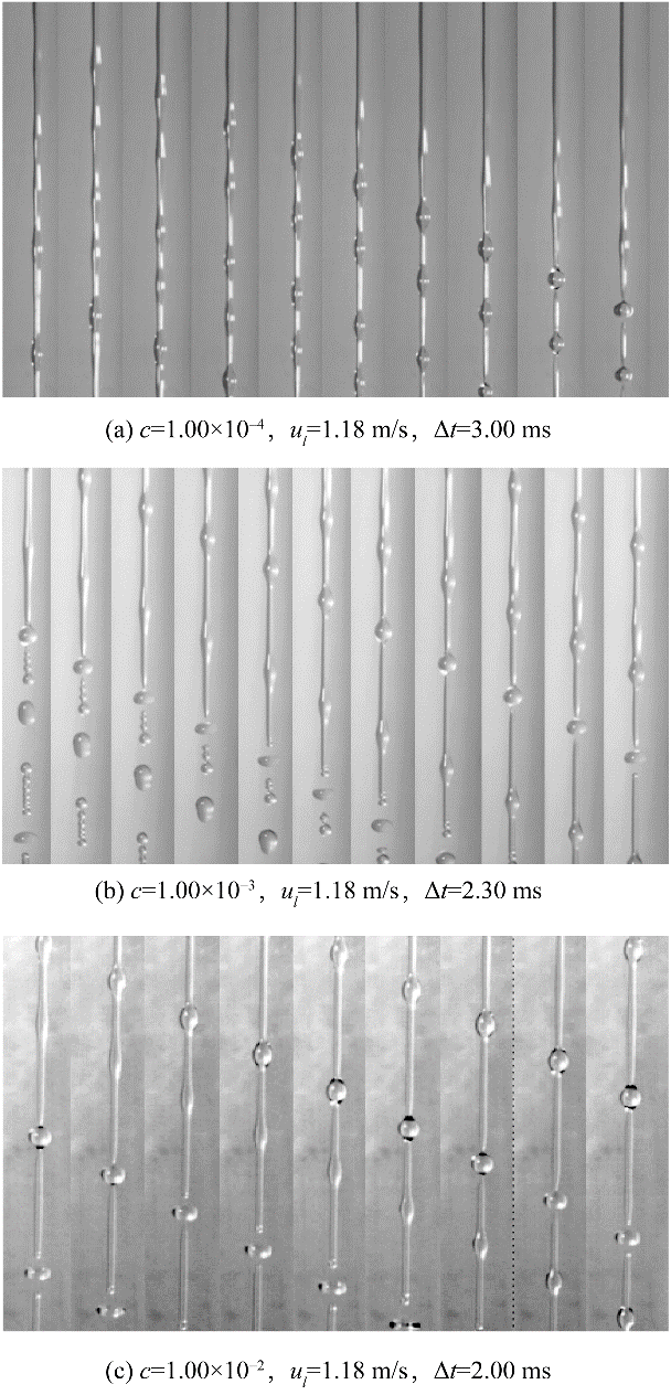 本文首先研究了不含氣泡的表面活性劑射流破裂過程以探究表面張力變化對射流破裂特征的影響。實驗使用高速相機記錄了六種不同濃度表面活性劑溶液的射流破裂過程。實驗獲得的射流破裂過程如圖5所示,其中Δt是相鄰兩張圖片間的時間間隔。從圖5中可以看出,雖然表面活性劑濃度并不相同,但射流的破裂過程在形態(tài)上是相似的。當液體射流離開噴嘴后,射流表面擾動迅速增長,表面波動在射流表面呈對稱分布,這是射流破裂Rayleigh區(qū)的典型特征。隨著表面波動的進一步發(fā)展,在射流方向上,射流表面形成瘤狀結構,射流破裂發(fā)生在兩個瘤狀結構之間。